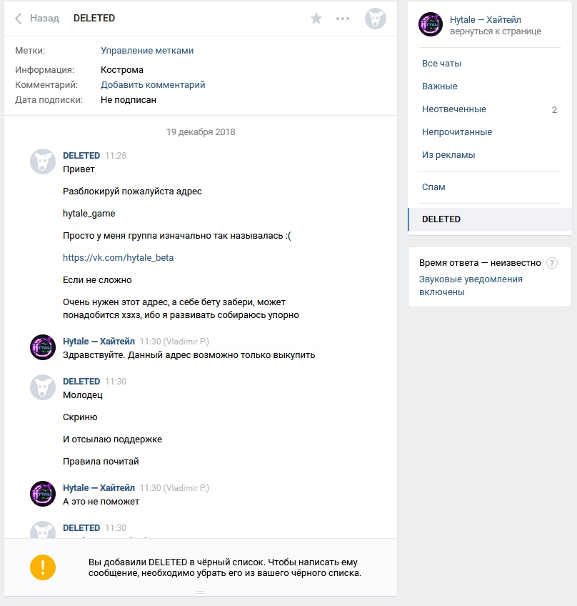 23 декабря 2018 года в 18:40 была заблокирована моя старая страница. Страницу заблокировали за попытку продать адрес сообщества ВКонтакте.
