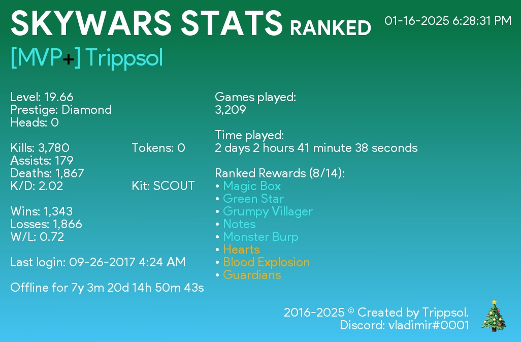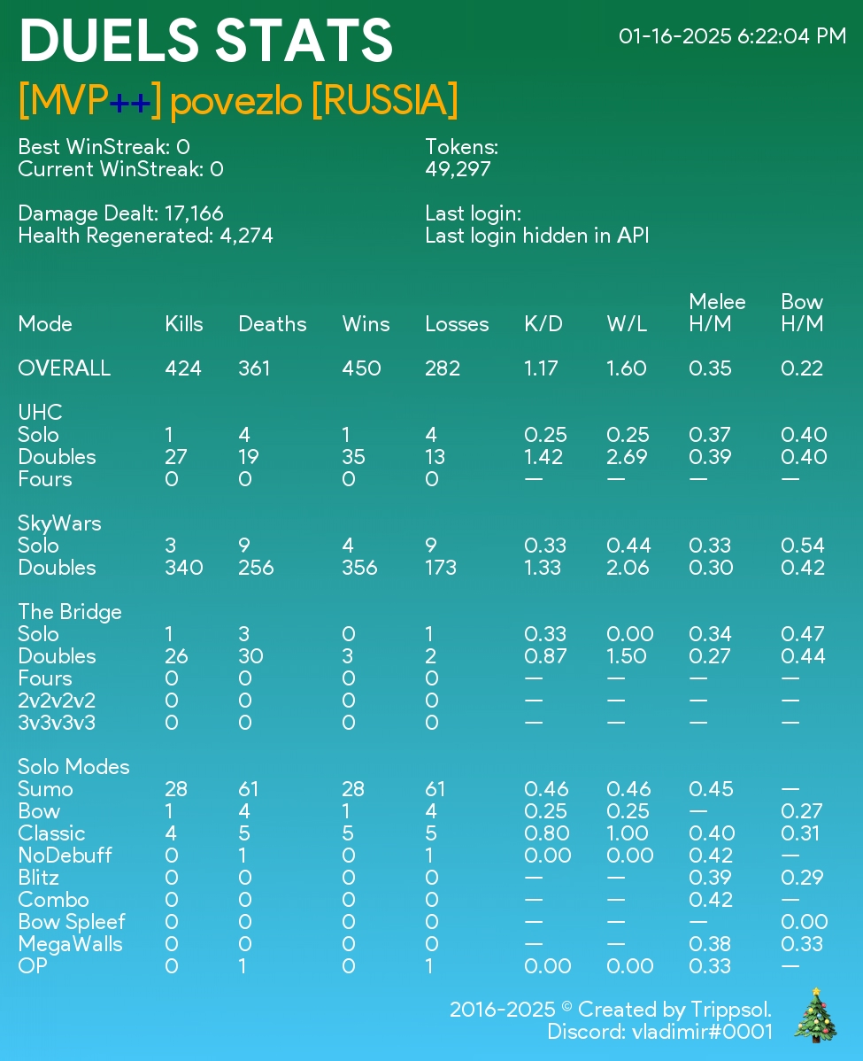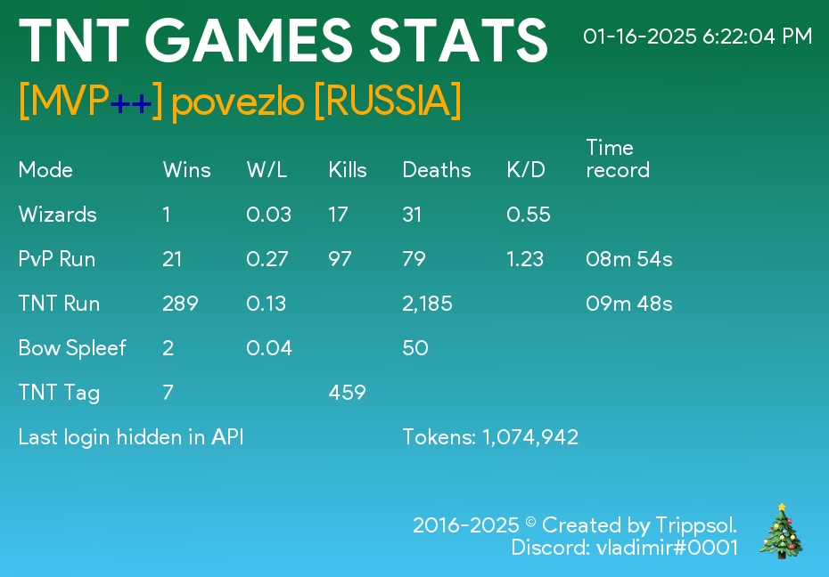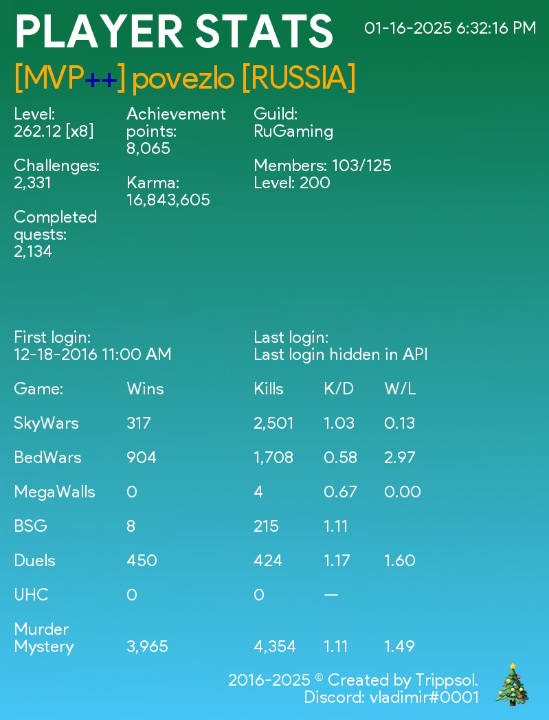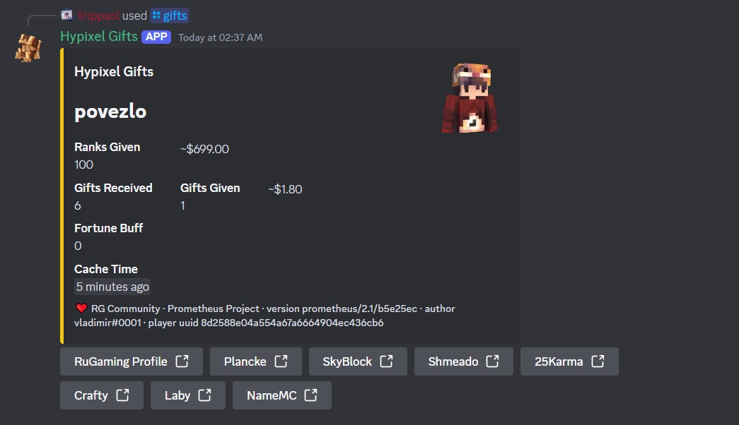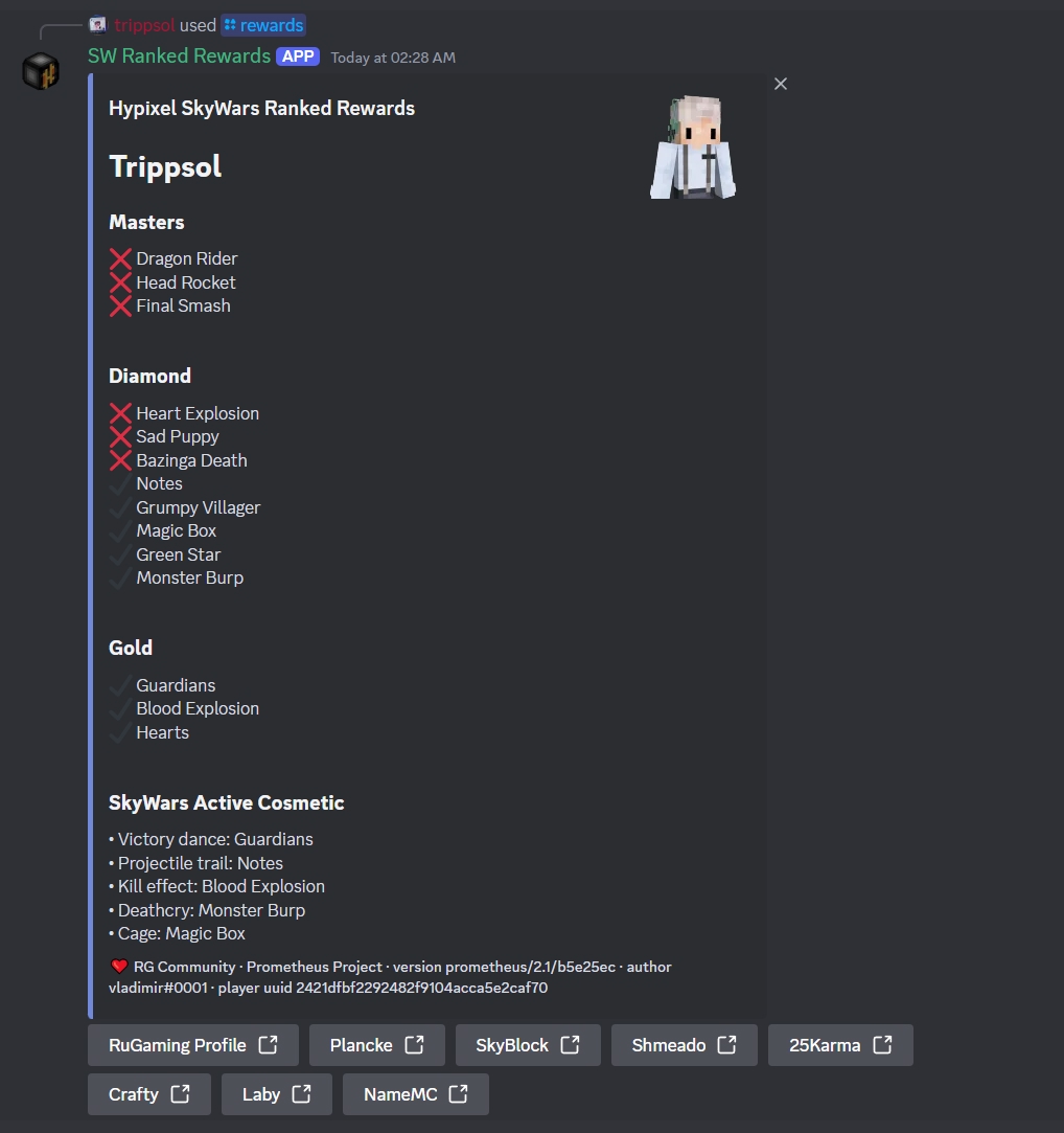 Теперь работает много альтернатив, которые выглядят лучше и предлагают больше. Но лично для меня этот проект остаётся в душе. Когда проект зарождался, не было популярных Discord ботов с функционалом такого уровня: игроки пользовались статистикой в ВКонтакте, либо Plancke.