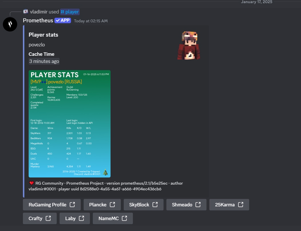 Впервые Discord бот Prometheus запущен в 2020 году. Бот позволял просматривать и сравнивать статистику в самых популярных режимах на Hypixel.