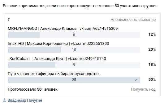 Итак, главным офицером назначается Максима Корнюшенко или Imax_HD (Скрин с голосованием - https://vk.cc/5l4NNT).