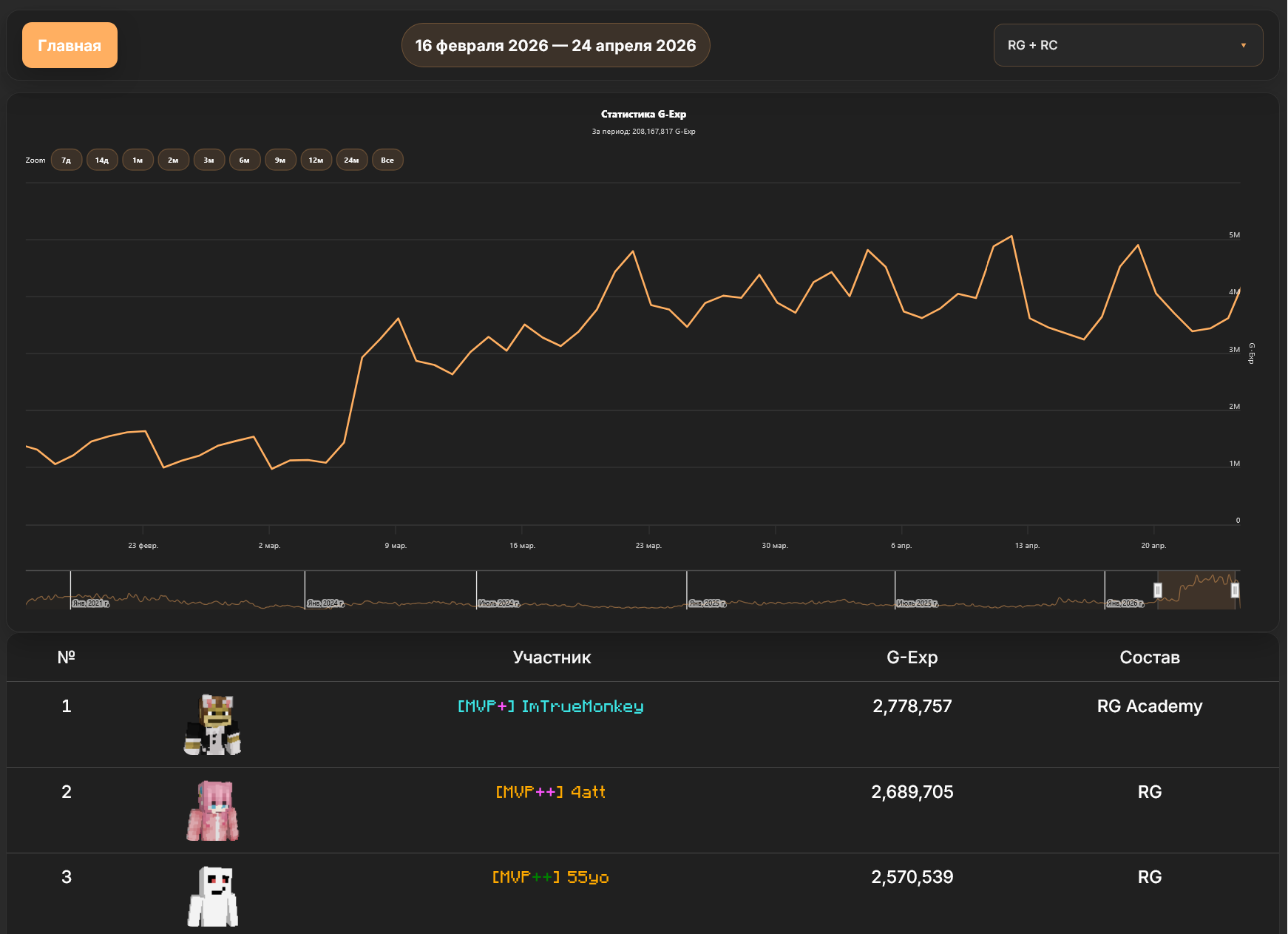 Проведена масштабная модернизация сайта: переработаны страницы со списком участников и отображением активности по G-Exp.